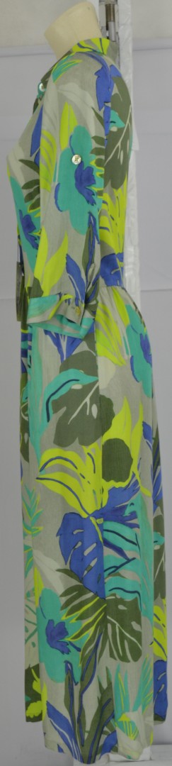 Das maxi lange sommerliche Kleid mit 3/4 Arm wurde mit floralem Dessing sowie Kragen aus leicht fließender Viscose zum durchknöpfen mit seitlichen Taschen gefertigt