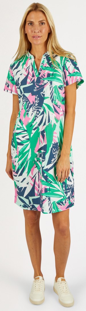 Das sommerliche Kleid in verkürtzter Länge wurde mehrfarbig gemustert mit 1/4 Arm sowie mit seitlichen Taschen und romantischem Ausschnitt designt