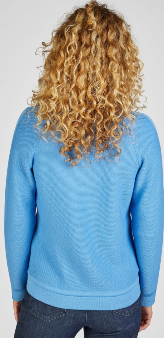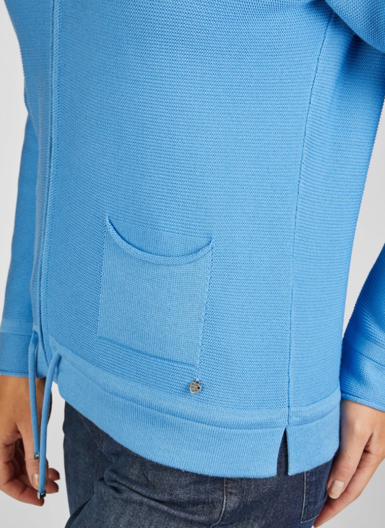 Diese sportive Strickjacke mit R-V sowie Bändchen und den zwei aufgesetzten Taschen wurde in uni bleu mit einer dezenten Rippen Optik designt und ist immer leicht zu kombinieren