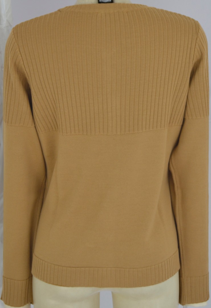 Eine hochwertige Strickjacke in uni camel mit rundem Ausschnitt sowie als 6 -Knopf Variante und zwei aufgesetzten Taschen die im oberen Bereicht mit dezenter Rippen-Optik designt wurde