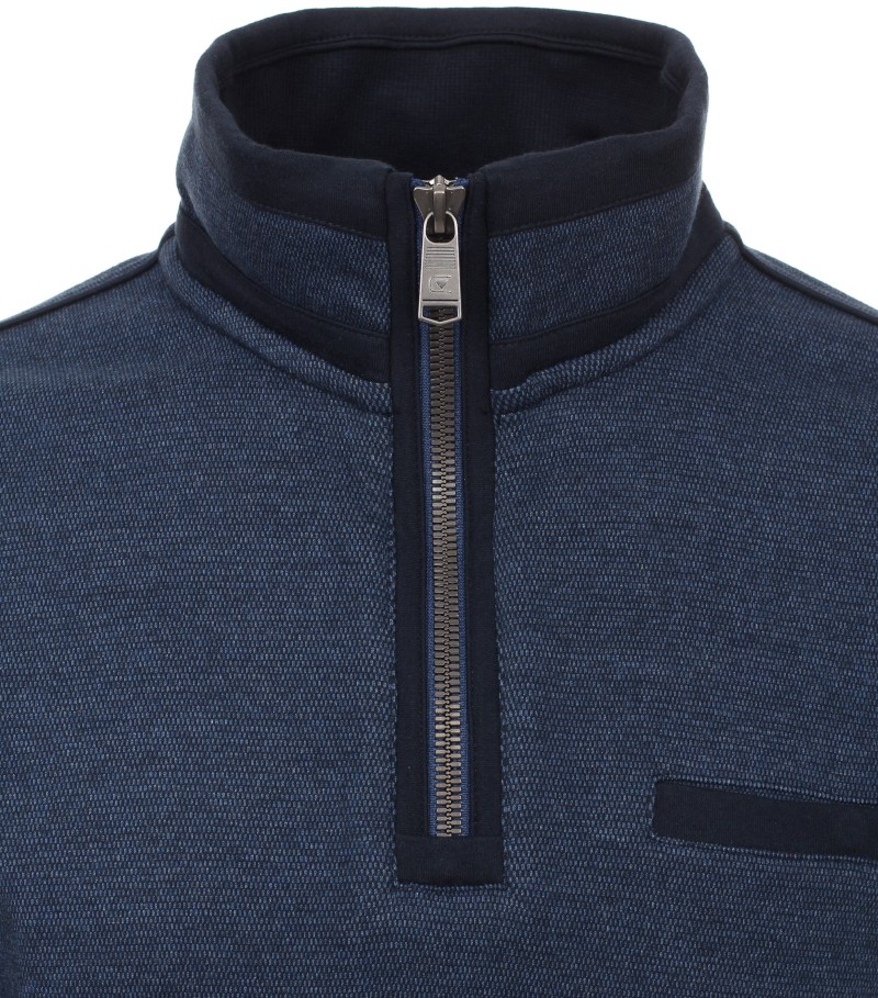 Dieses aktuelle Sweat Shirt wurde in blau-marine mit feiner Struktur designt. In Troyer Form also mit Reißverschluss am Kragen ist dieses Sweat aus reiner Baumwolle vielseitig zu kombinieren und zudem pflegeleicht
