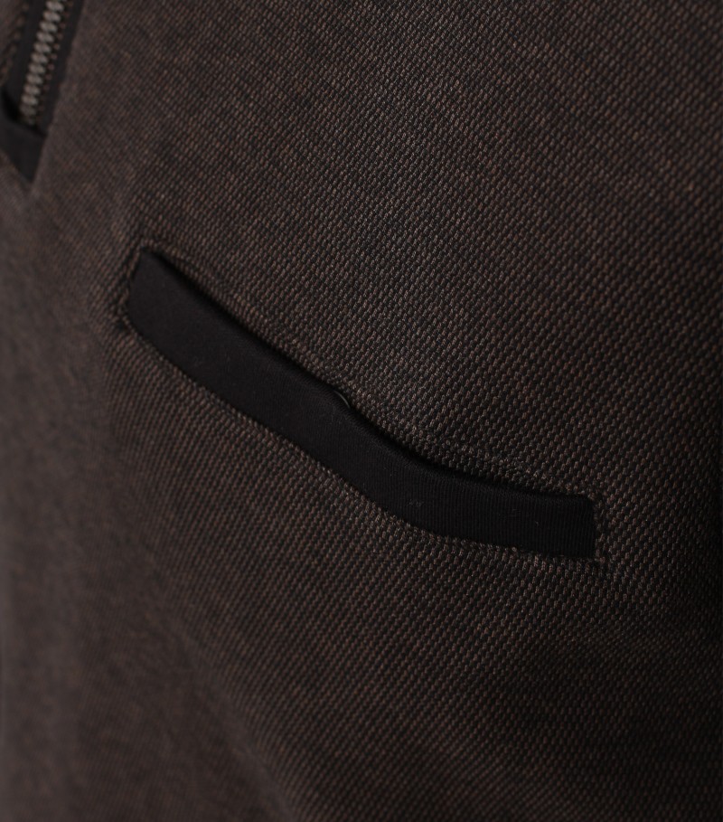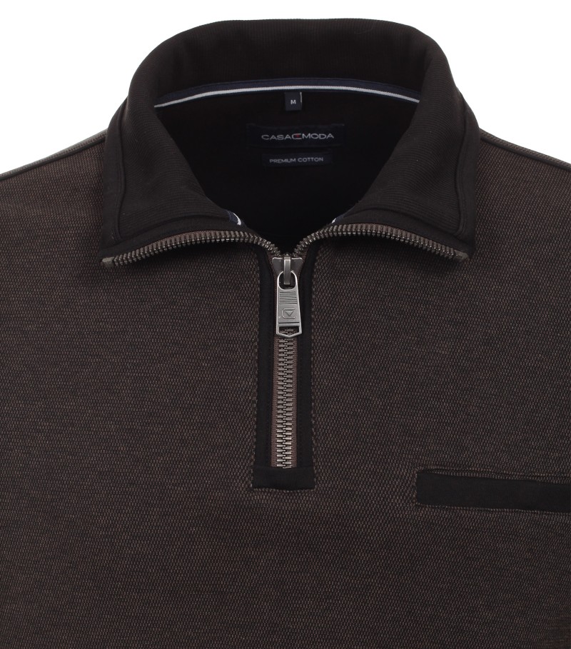 Dieses aktuelle Sweat Shirt wurde in braun-schwarz gemustert mit feiner Struktur designt. In Troyer Form also mit Reißverschluss am Kragen ist dieses Sweat aus reiner Baumwolle vielseitig zu kombinieren und zudem pflegeleicht
