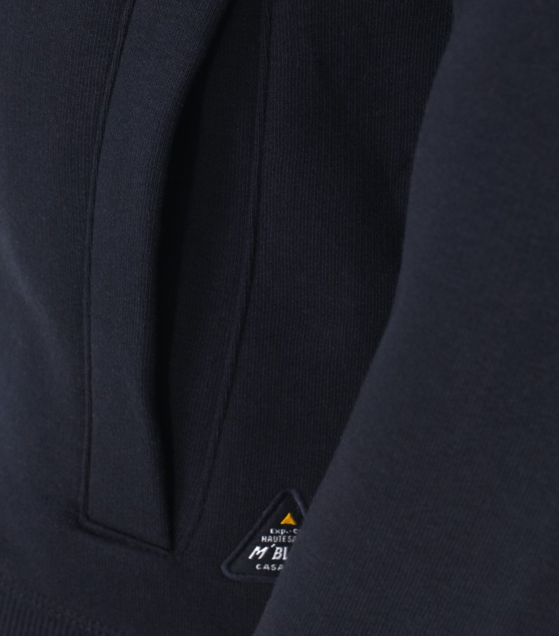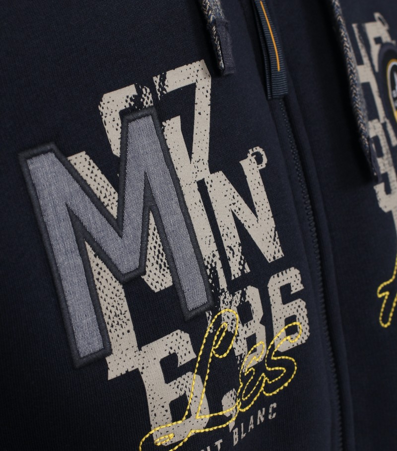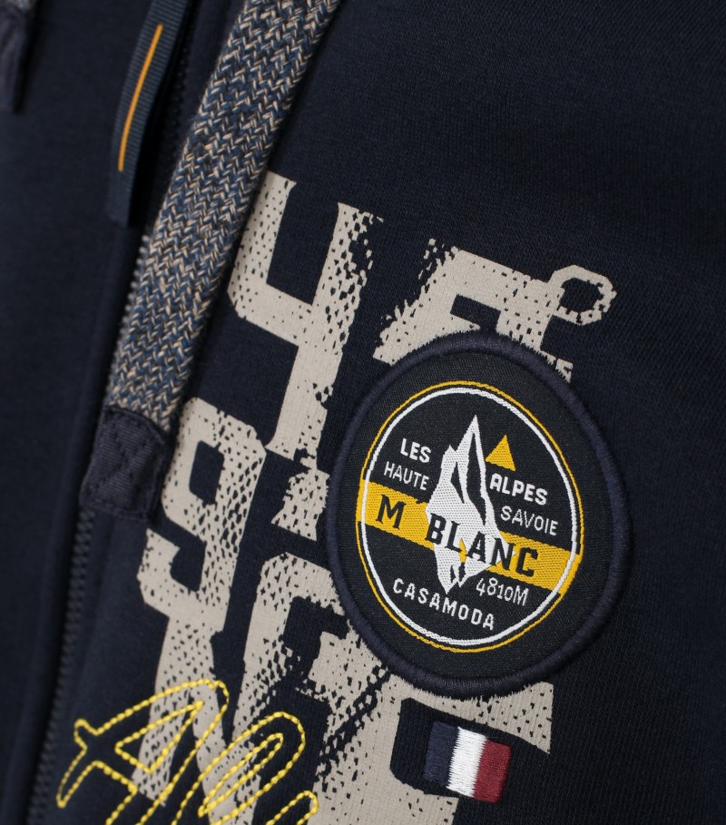 Die Sweatjacke wure in dunkel blau mit sportivem Print vorne designed. Mit R-V sowei zwei seitlichen Taschen und Kapuze lässt sich diese Jacke das ganze Jahr hindurch leicht kombinieren