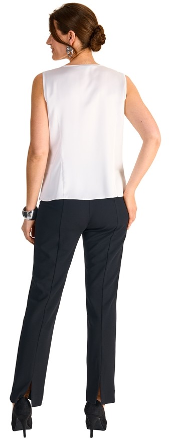 Dieses Top mit Wiener Nähten aus chrash-satin in uni marshmallow wurde vorne mit zwei kurzen Schlitzen versehen und lässt sich auch zu besonderen Anässen prima kombinieren. Die romantische Raffung unter dem runden Ausschnitt verleiht hier einen zusätzlichen Charme