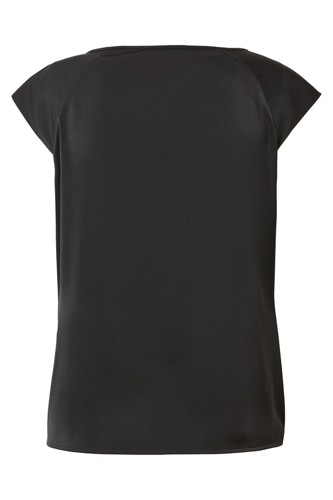 Dieses edle Top wurde in uni schwarz designt. Mit Schmuckstange sowie überschnittenem Arm und Raffung unter dem runden Ausschnitt lässt sich dieses Modell mit leichtem Glanz auch zu den besonderen Anlässen prima kombinieren